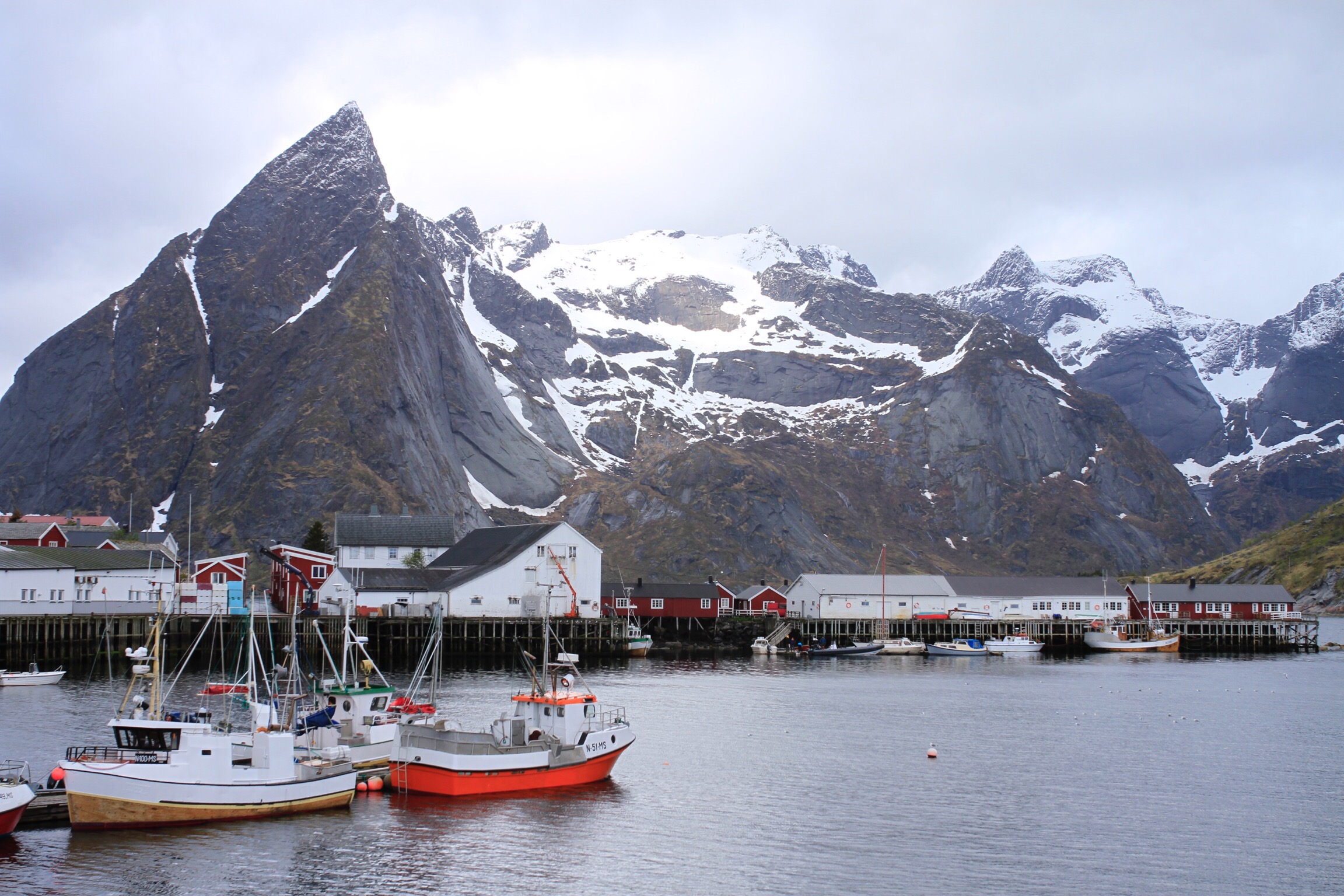 Tourism and fish are the sources of income here. Stock fish are hanging everywhere, and the boats bringing it in looks something like this. The mountains are magnificent, and the light has so many surprises all the time!